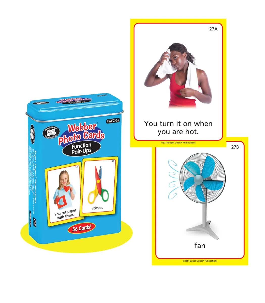 Οι κάρτες “Βρείτε το αντικείμενο που ταιριάζει” (Webber Photo Cards - Function Pair-Ups) βοηθούν τα παιδιά να μάθουν να αναγνωρίζουν και να περιγράφουν καθημερινά αντικείμενα.