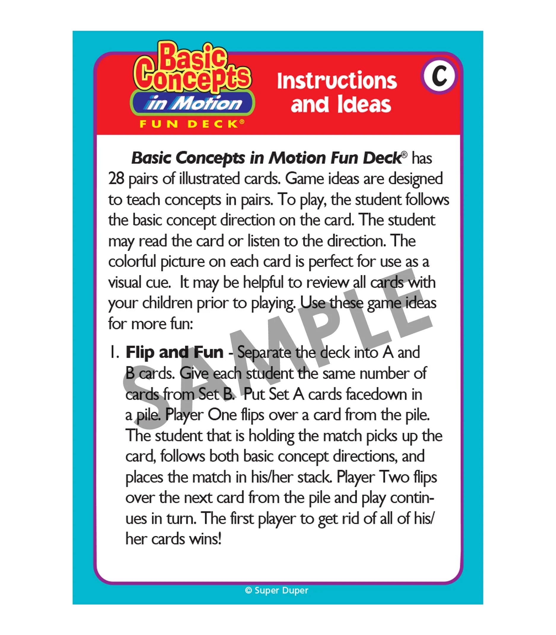 Αυτό το παιχνίδι καρτών περιέχει 28 διασκεδαστικά ζευγάρια ιδεών για να διδαξουν τις έννοιες κίνησης και να βελτιώσουν την ικανότητα του παιδιού να ακολουθεί οδηγίες και να αναπτύσει σημαντικές δεξιότητες.