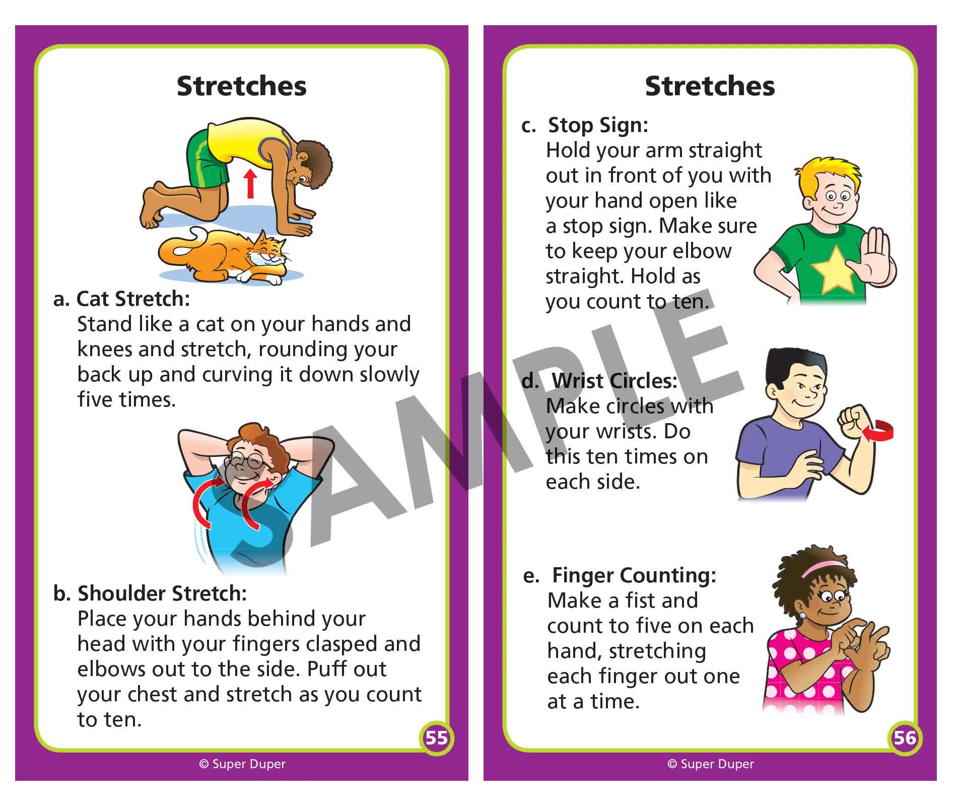 - 56 κάρτες διπλής όψης 7,62 x 12,70 cm (το μπροστινό μέρος της κάρτας παρουσιάζει μια δραστηριότητα του πάνω μέρους του σώματος με μία μεγάλη εικόνα ενώ η άλλη πλευρά περιγράφει τη δραστηριότητα κίνησης με μια μικρότερη εικόνα),