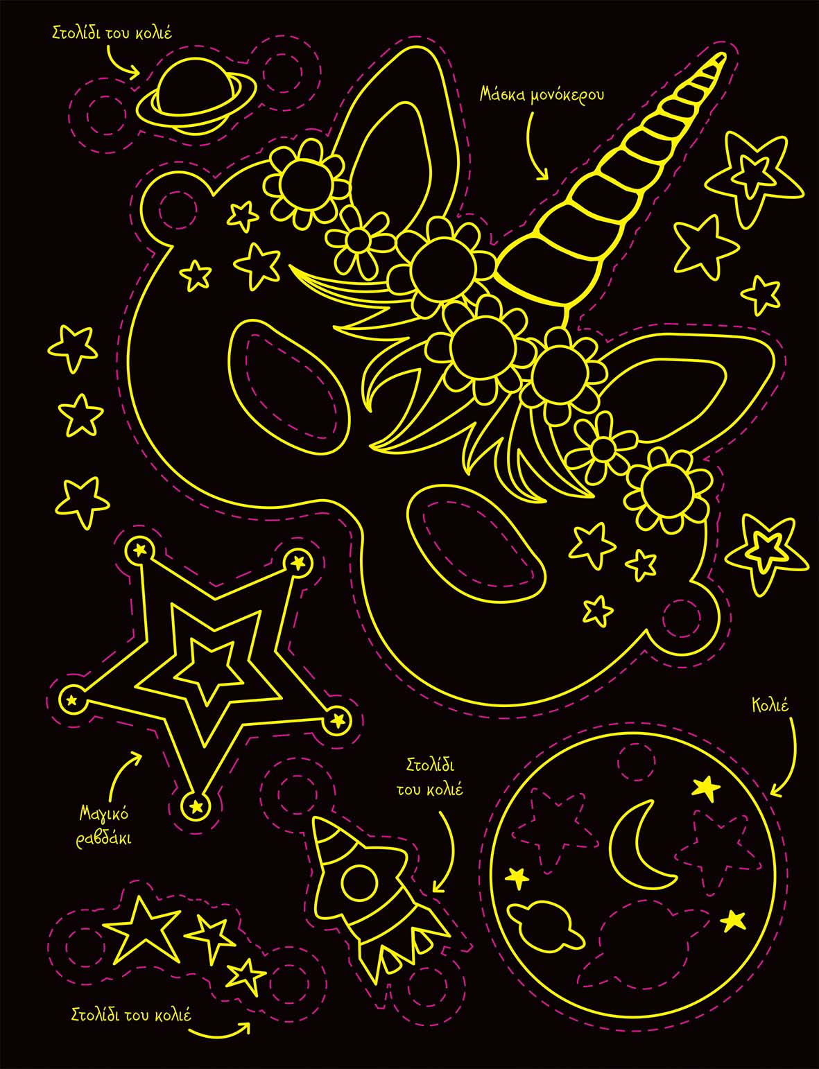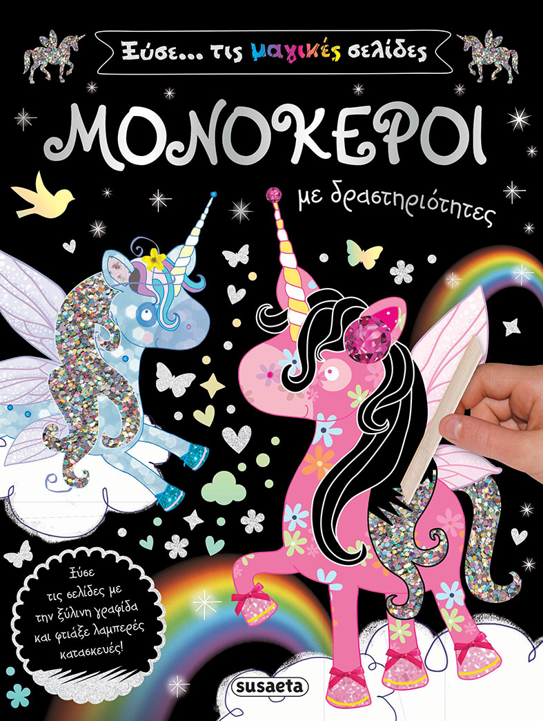 Διασκέδασε με τους αγαπημένους σου μονόκερους και ταξίδεψε στον αστραφτερό κόσμο τους! Το βιβλίο είναι γεμάτο δραστηριότητες, ενώ στις τελευταίες σελίδες θα βρεις απίθανα αξεσουάρ για μονόκερους και πολλά άλλα σχέδια εμπνευσμένα από τα υπέροχα αυτά πλάσματα. Ξύσε τα με την ειδική γραφίδα για να αποκαλύψεις αστραφτερές λεπτομέρειες και παίξε ατέλειωτες ώρες παρέα με τις φίλες σου!