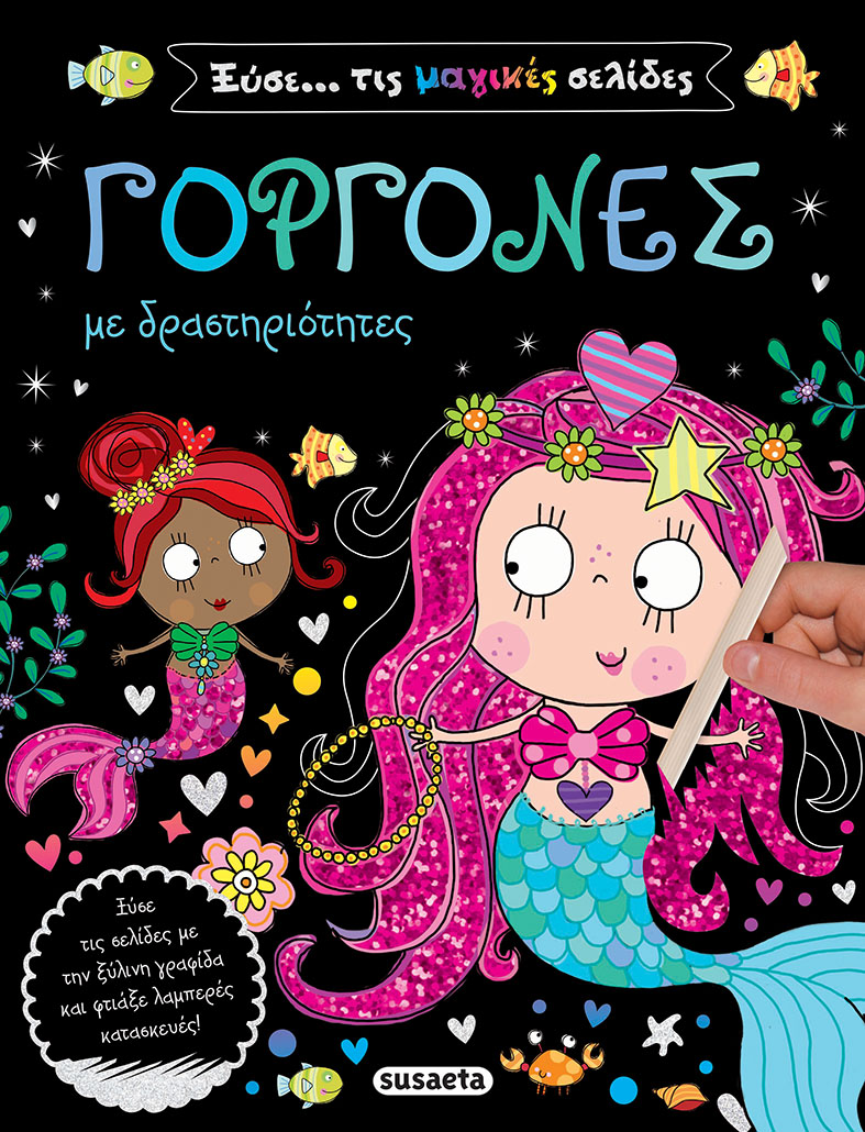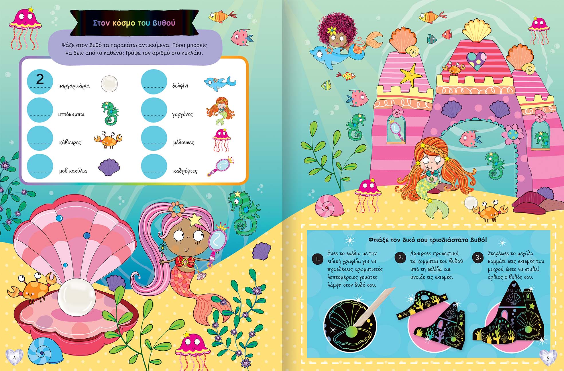 Διασκέδασε με τις αγαπημένες σου γοργόνες και βυθίσου στον μαγικό κόσμο τους! Το βιβλίο είναι γεμάτο δραστηριότητες, ενώ στις τελευταίες σελίδες θα βρεις απίθανα αξεσουάρ για γοργόνες και πολλά άλλα σχέδια εμπνευσμένα από τον βυθό. Ξύσε τα με την ειδική γραφίδα για να αποκαλύψεις αστραφτερές λεπτομέρειες και παίξε ατέλειωτες ώρες παρέα με τις φίλες σου!
