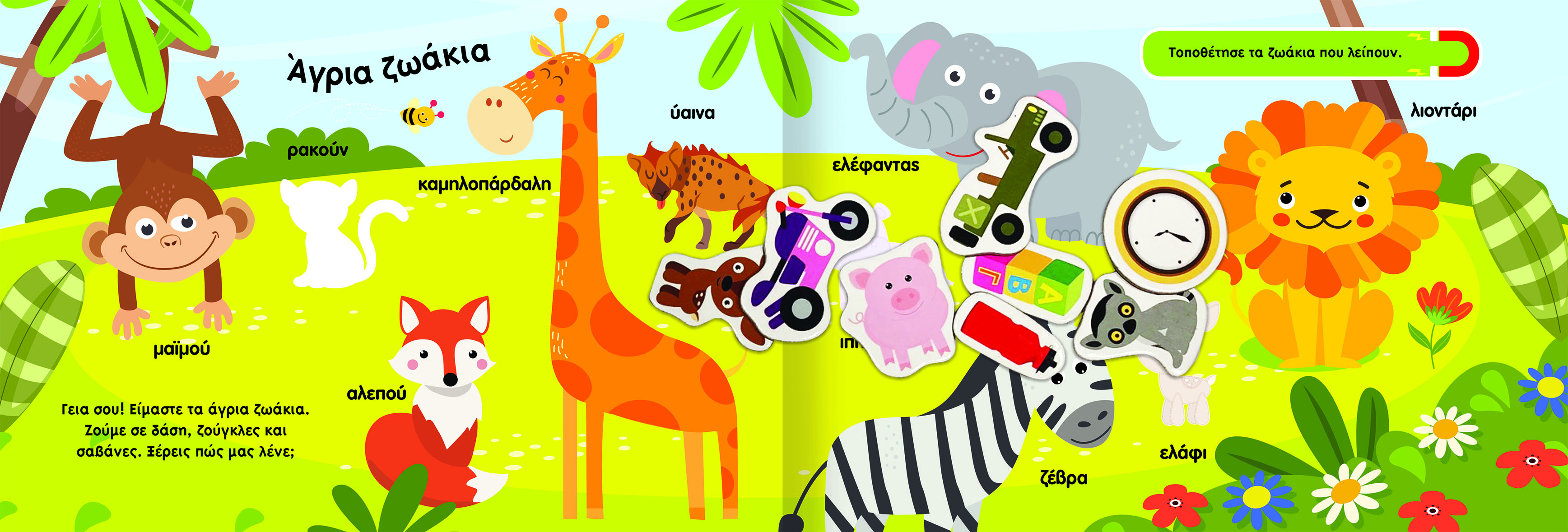 Μέσα από το παιχνίδι µαθαίνεις διασκεδάζοντας! Παίξε µε τα µαγνητάκια, τοποθέτησέ τα στη σωστή θέση σε κάθε σελίδα και µάθε καινούριες λεξούλες!