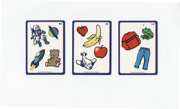 These 54 cards are divided into two stages of difficulty - 28 three-object scenes and 26 four-object scenes.