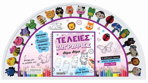 32 σελίδες και μία συλλογή από 10 μολύβια, 10 ξυλομπογιές, 20 γόμες και 1 ξύστρα, σε πλαστική θήκη.