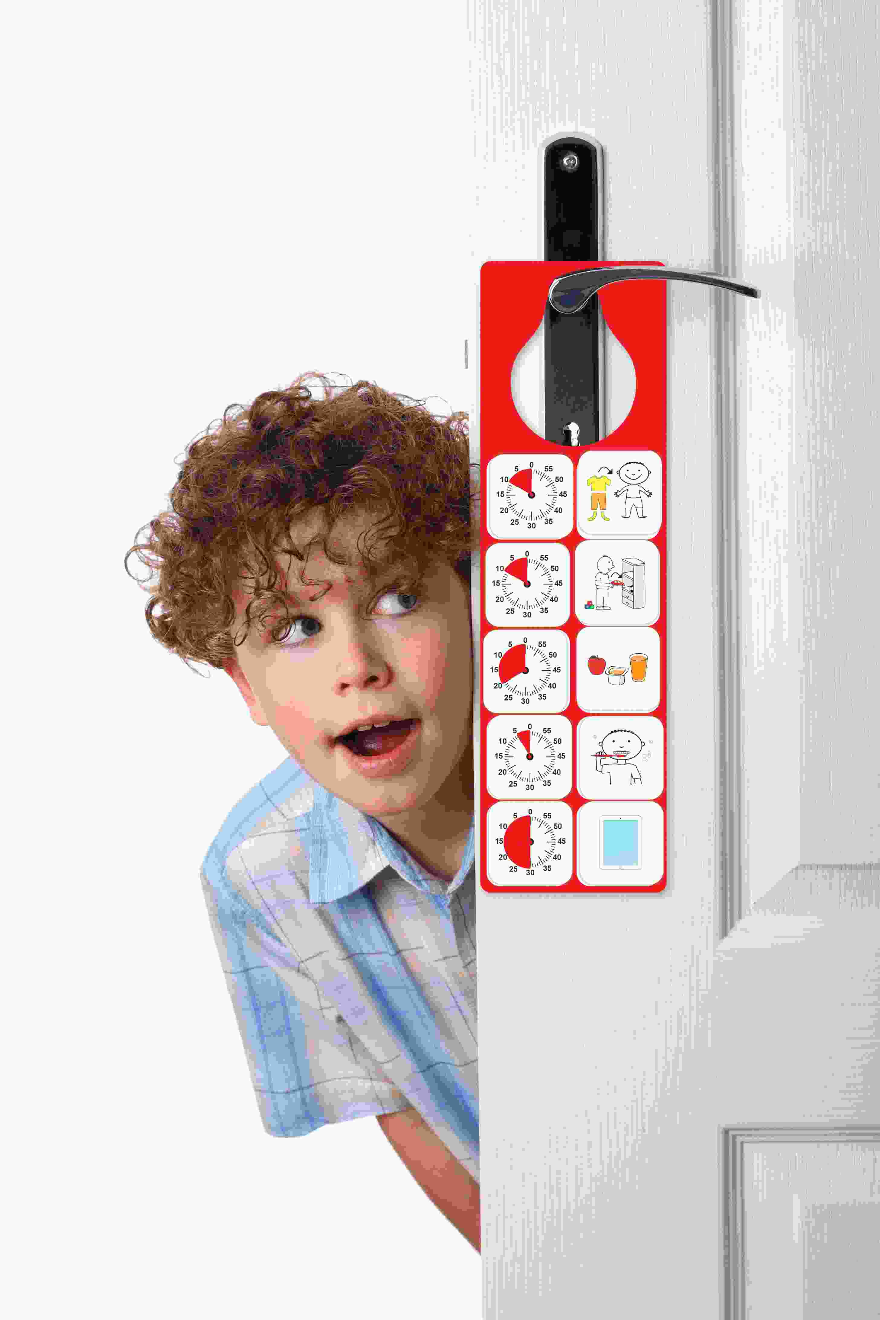 The magnetic door hanger can be hung on a door handle or placed on any metal surface. Simply place the magnetic pictograms on the hanger and create the activity or routine of your choice.